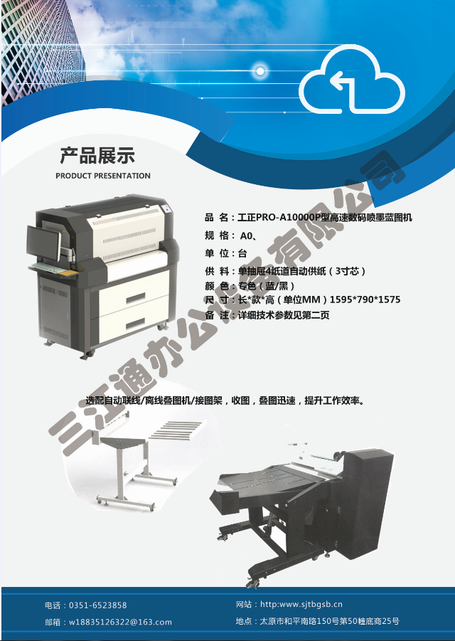 太原市三江通辦公設備有限公司是一家專業從事曬圖機、數碼復印機、多功能打印、復印、掃描、縮放一體機、模擬工程復印機、繪圖儀、大型掃描儀、電子歸檔設備、手動、自動成形圖紙檔案密集柜、圖前圖后設備以及所有制圖設備耗材供應、維修一條龍的實體企業。多年來,已與日本、北京、天津、上海、杭州等諸多家廠方多方合作,成為山西>>更多